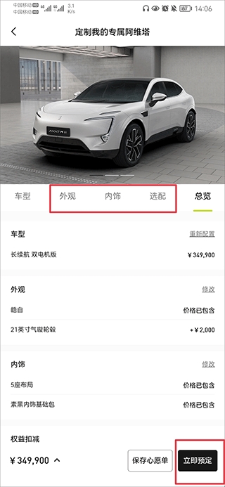 3、然后将外观颜色、轮胎、内饰、配置等选择完后,点击立即预定