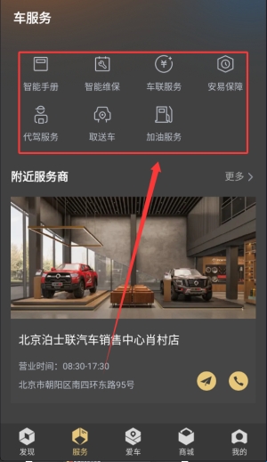3、服务板块提供智能车辆手册、维保预约、车联服务、安易保障、代驾服务及取送车功能。