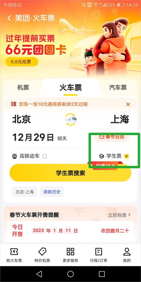 1、首先进入【火车票】页面处,确定好出行地点和时间后勾选【学生票】(下图绿色方框处),以学生票方式搜索是否有余票