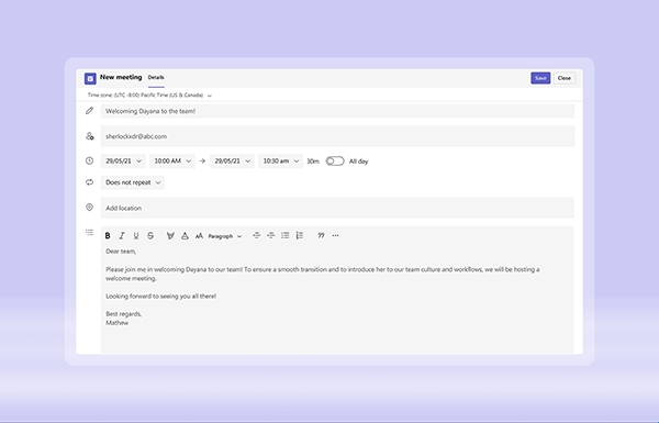 提前规划会议,并通过电子邮件地址或电话号码邀请任何人。分享会议链接,让参与者轻松从任何地方加入。