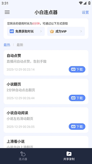 1、连点加速,自动执行:随时在任何位置记录点击或滑动操作,解放用户双手,实现连续点击加速,轻松设置点击频率、时间间隔;