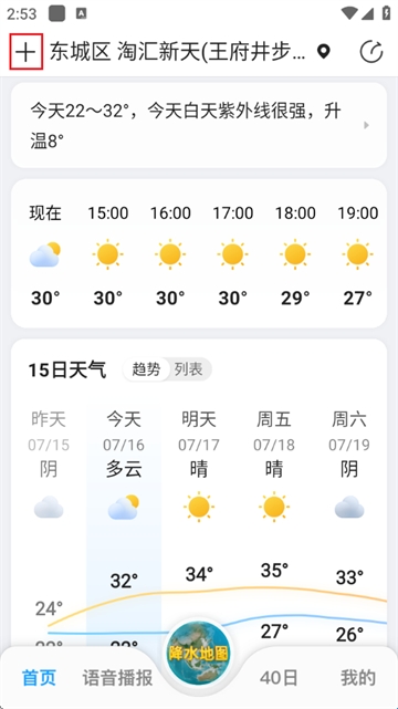 1、打开15日天气预报app,在首页的左上角有个“+”,点进去;