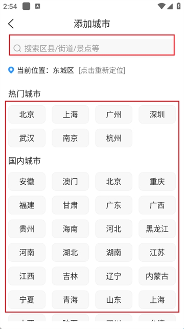 3、搜索自己想要查询的城市或者直接在热门城市、国内城市内进行查找;