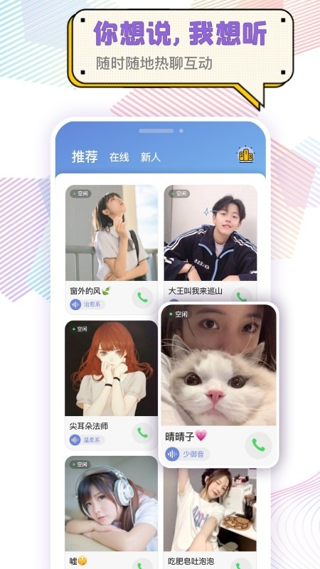 2、通过声音匹配的方式为用户带来交友的机会,随时随时畅聊哦!