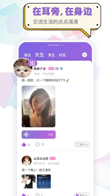 非常适合单身男女用户脱单使用的社交平台,专注于语音聊天互动,让大家可以快速遇见心动的声音,让你可以轻松寻找一个能够倾听你故事的人,为你提供暖心的倾听与陪伴,还可以将你的生活动态分享发布,让更多人快速认识你了解你,帮助用户提高交友效率,成功遇见真爱顺利的脱单交友。