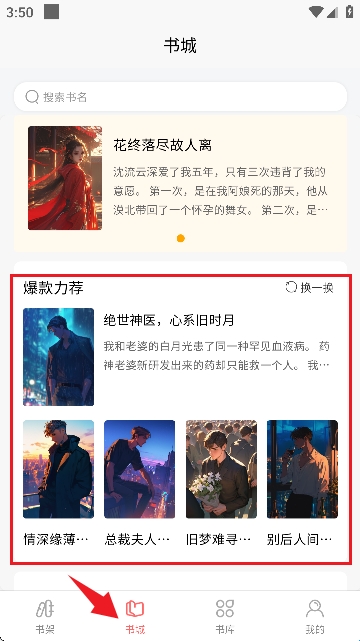 2、进入“书城”页面,可以看到推荐的热门小说榜单,方便挑选。