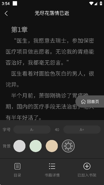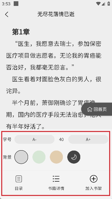 5、阅读界面简洁清爽,没有广告打扰,通过功能面板可以调整字体大小、背景色,查看目录或书籍详情。