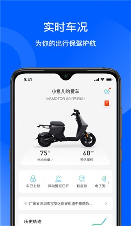 - 查看实时车况数据:剩余电量和预估里程、实时定位、异动警报、电子围栏、历史轨迹;