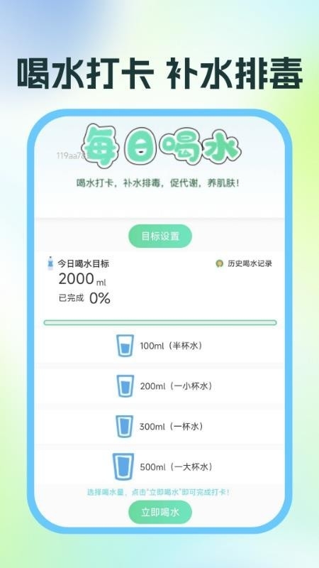 2、喝水打卡,可设置每日喝水目标,记录喝水进度,助力养成良好补水习惯。