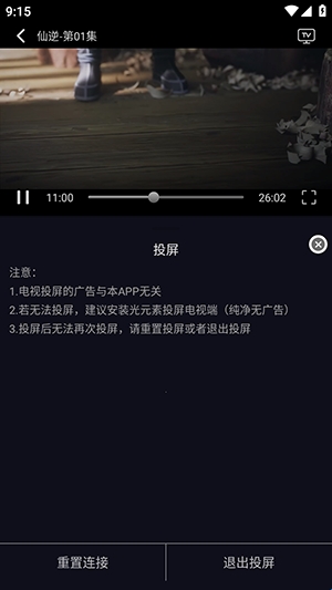 4、点击影片即可快速播放,在播放界面点击右上角的TV图标可以搜索投屏设备。