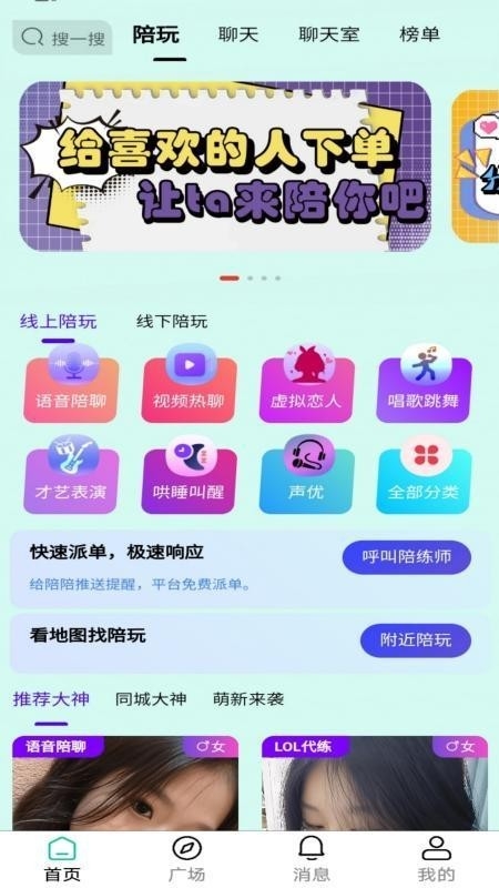 2、根据自身需求选择不同类型的陪玩服务,还能快速派单,平台会免费推送提醒。