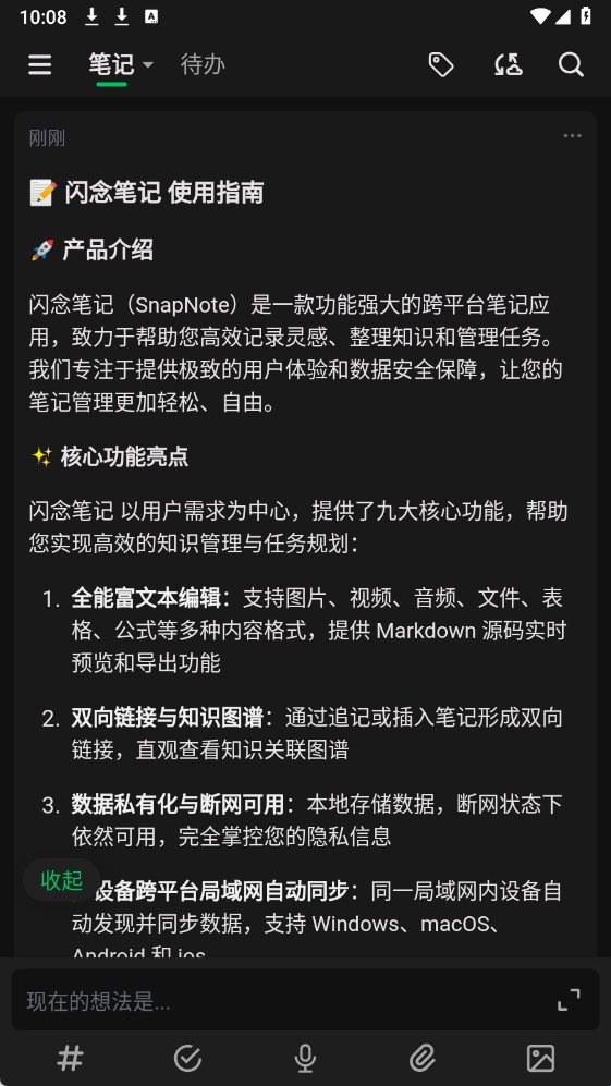 闪念笔记是一款海量用户在用的笔记记录软件,软件当中具有强大的笔记记录功能,大家可以将自己平时比较重要的文件等东西储存在其中,并且大家还可以将自己的内容进行一个上锁设置,这样能够更好的保护我们的隐私,需要的朋友还在等什么呢,一起来下载使用吧!