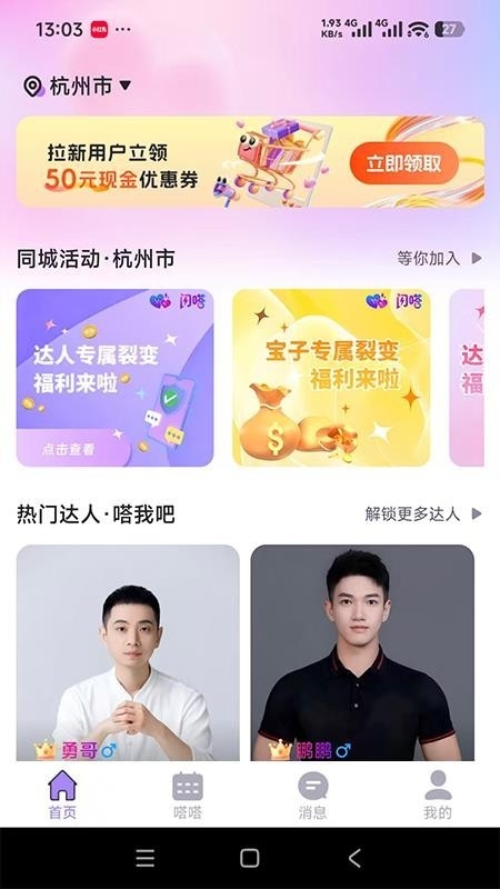 3、在软件首页界面上方就可看到多种同城活动,点击选择“达人专属裂变福利”按钮来进行下一步。