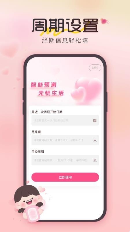 4.最后在“月经设置”填写菜单界面,输入开始日期、月经期、周期后,在点击“立即使用”按钮就完成了