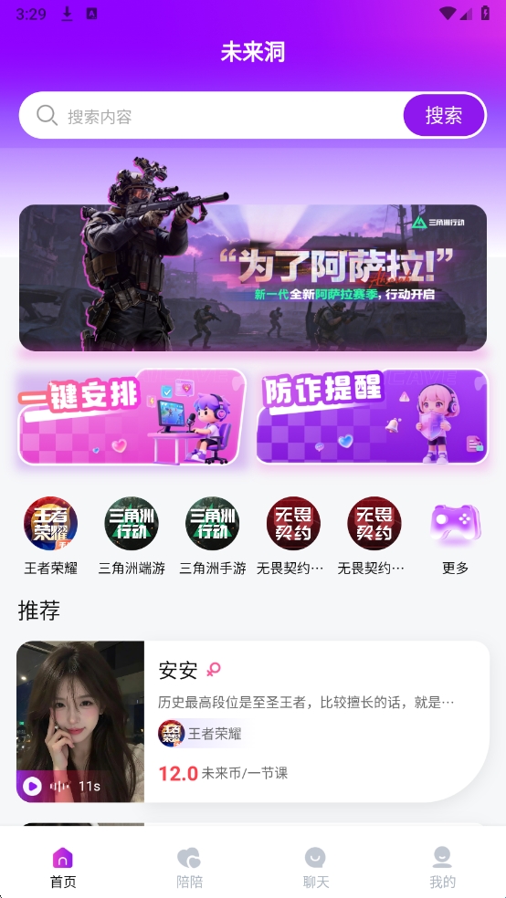 未来洞是一款游戏陪玩软件,软件当中具有海量的游戏陪玩,无论是和平精英还是王者荣耀都是可以寻找陪玩的哦,而且陪玩导师还会根据战场的思路以及打法进行一对一的专业讲解,让您的意识和游戏思维有很大的提高,让您的游戏技术有一个质的飞跃,喜欢的朋友一起来下载吧!