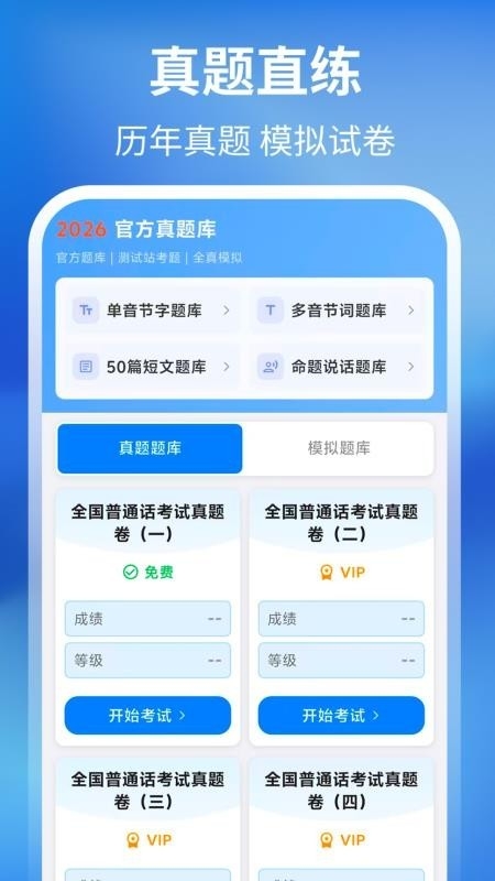 全真试题,AI智能语音技术模拟正式普通话考试,帮你提前预估自身的普通话水平,为实地参加普通话水平测试打好基础。