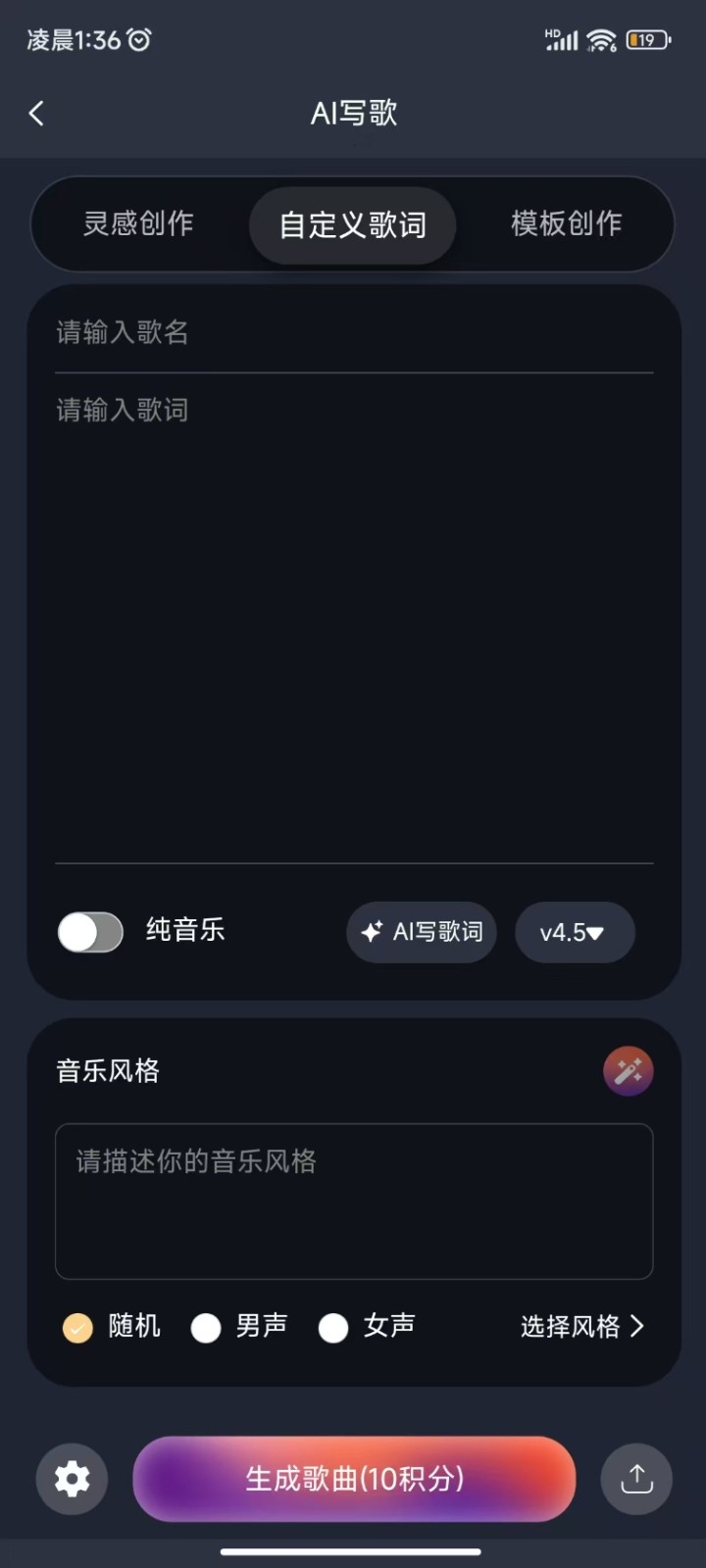 1、AI写歌神器:输入需求快速生成歌词与旋律,支持自定义曲风