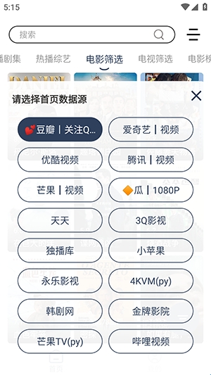 1、软件自带影视源配置接口,点击右上角的符号可以切换影视源。