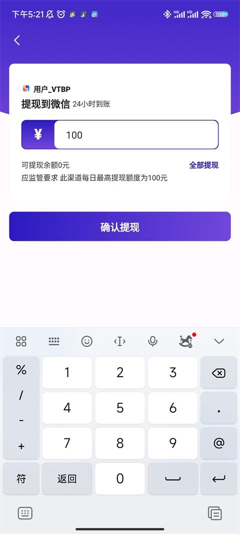 注意:最高提现100元,每天只能提现一次,三个工作日到账哦!