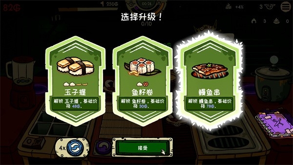 6、在屏幕下方会显示寿司售价,它的计算会随所选食材和升级卡变化。