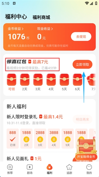 5、根据看短剧时长,点击屏幕右侧的“立即领取”,也可以领取部分金币,完成屏幕下方的任务也可以获得大量的金币收益。