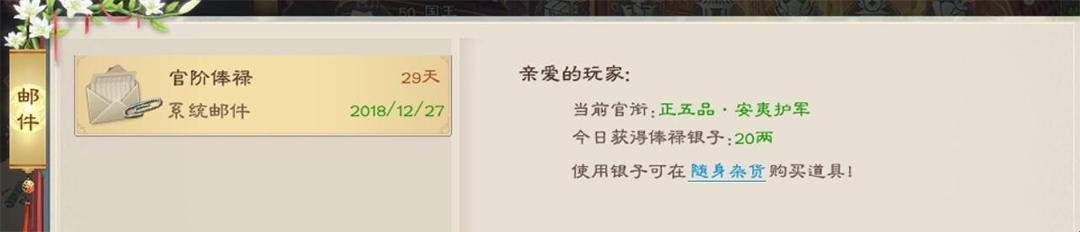 4、功勋值奖励达到对应官职,可以领取每日官职俸禄,俸禄通过系统邮件自动发放。在每月末将根据官职等级,发放月末晶石宝箱。