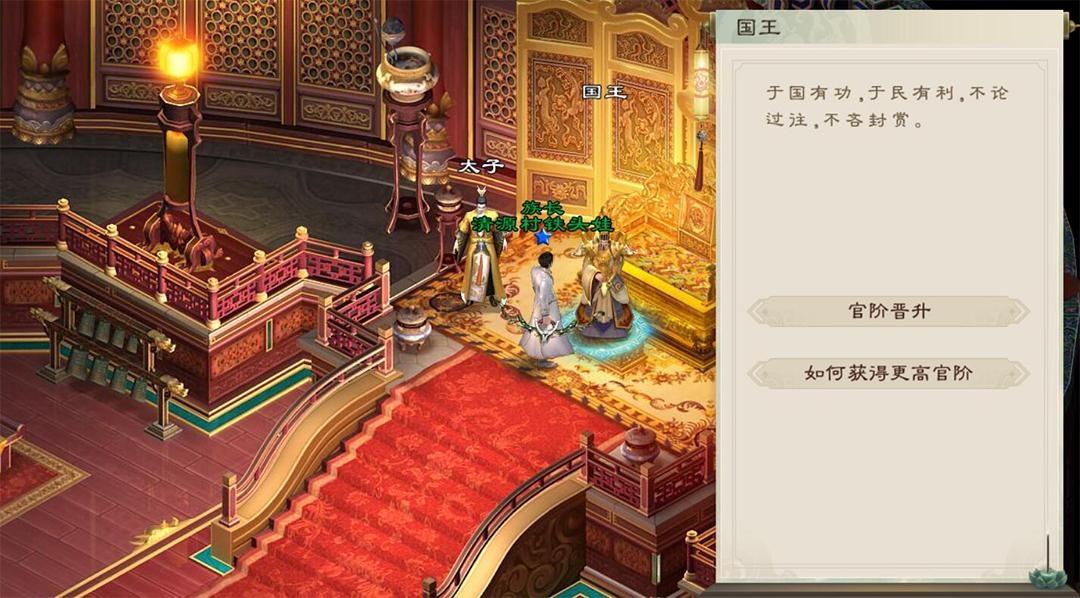 2、功勋值的使用功勋值积累满足下一等级官职要求时,可以点击【前往晋升】,在国王处晋升官阶,获得更高的官阶属性、称号和俸禄。