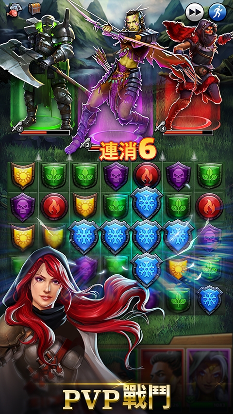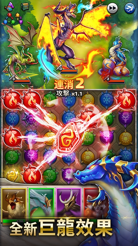 1、多元融合玩法:将经典的三消玩法与深度策略战斗相结合,通过消除宝石来积攒能量,释放英雄技能进行对决。