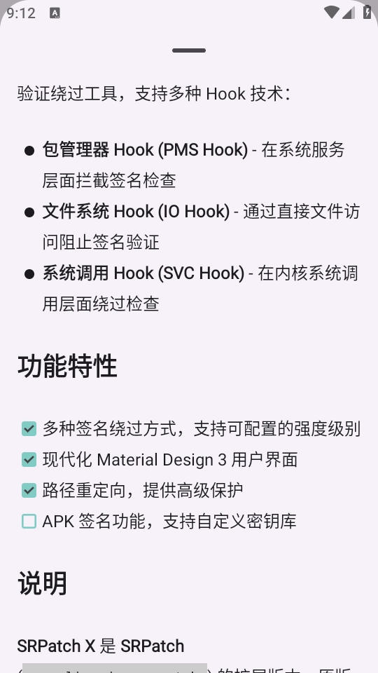 1、多模式去签技术:支持基础PMSHook、10Hook+PMSHook强化模式、MoreHook技术拓展及SVCHook系统调用保护,可适配不同Android版本的校验机制。
