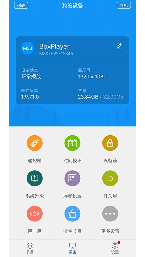 手机APP“屏掌控”除了更新节目外,还可以设置LED显示屏开关机、亮度、时间校正、遥控器和控制卡选型。