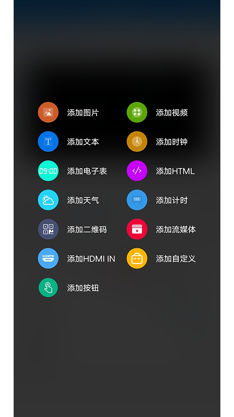 点击节目编辑界面右下角“+”图标,可选择添加视频、图片、文本、动画字、时钟等内容,并可自由设置显示特效和区域位置等。