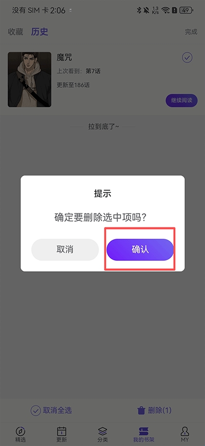 2、勾选你要需要清除的漫画并点击右下角删除键,也可以点击左下角全选一键删除全部历史记录;