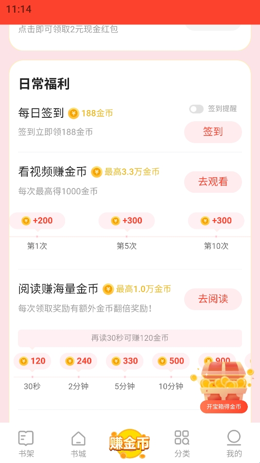 3、然后还有一些日常福利,阅读,看视频、听书也可以赚海量金币