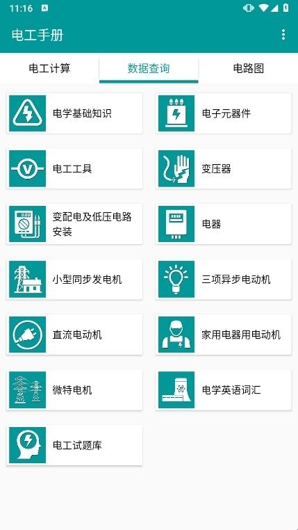 1、我们运行电工手册APP后,就可以在电工计算、数据查询、电路图三大版块中选择你想要的查询功能。