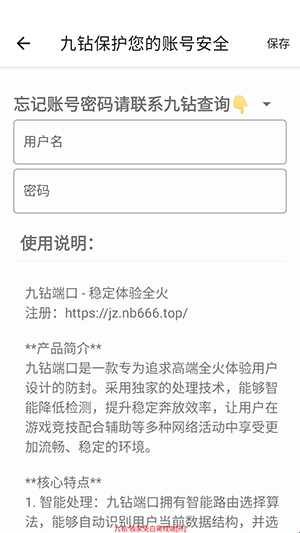 手机的网络不稳定?打游戏老是卡顿或者掉线?那就来试试九钻端口吧。进入软件时需要输入账号密码,账号密码全部都是jznb6,进入后可以看到软件中可以手动配置多种规则,如果不知道如何配置参数的话,也可以进入其中选择一键配置,使用起来非常简单,有效解决卡顿情况。