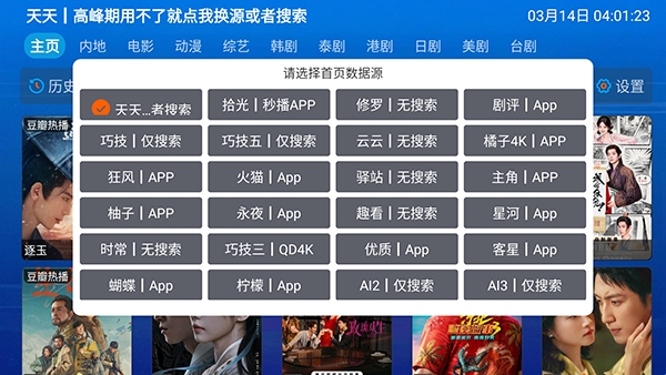 1、软件自带影视源接口配置无需导入,点击左上角的主页选项可以进行切换。