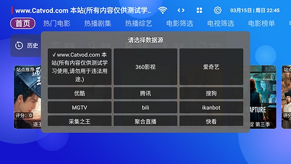 1、软件自带影视源接口配置,无需导入,点击左上角的影视源接口可以进行切换。