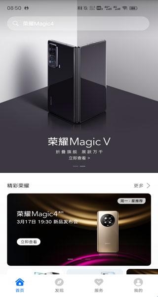 1、打开我的荣耀app,在首页你可以看到很多关于荣耀手机的信息;