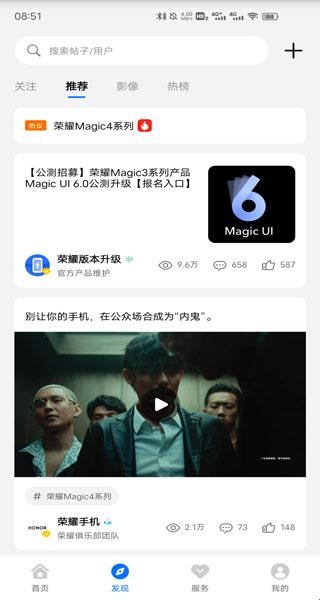 2、点击发现,你可以在这里搜索有关荣耀产品的帖子;
