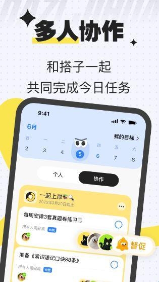 是专注于为用户实现自律规划的软件。用户可以在该平台寻找一起实现自律计划的搭子,无论是学习,工作,健身,减肥等等自律计划都可以在其中设定并寻找搭子。搭子之间互相监督,避免因为无人监管而导致计划半途而废。
