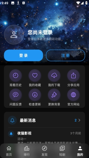 一款可以让用户随意进行点播的影视软件——夜猫影视。该软件支持用户进行登录,登录后可以在多个设备之间自由的同步数据,更换手机后也可以保存数据哦;在观看时如果遇到了自己很喜欢的影片,还可以点击收藏,这样方便后续找到该影片继续观看。