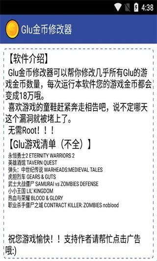 游戏中的金币总是不够花?想不想体验无限金币的乐趣?试试这款glu金币修改器,这款修改器完美兼容多种安卓机型,可以轻松修改市面上各种热门游戏中的金币数量,不需要root权限,让你在游戏中再也不会因为金币数量而烦恼!