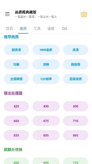 在游玩和平精英时感觉到画面模糊?想要优化游戏的画质?那就来画质阁典藏版吧。在这里有着多种画质可以解锁,根据自己手机的配置酌情解锁哦,不然可能会导致游戏卡顿,运行不流畅;除了解锁画质外,还有许多的小工具可以使用,如游戏准心,一键开启性能模式,一键录屏等。