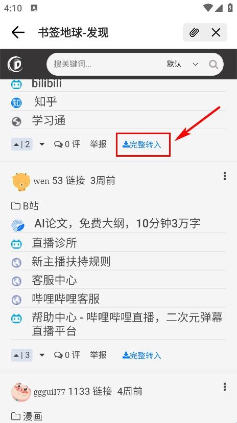 1、打开书签地球app,在首页点击左下角图标,可以看到最新分享出来的书签和历史分享的书签(按时间倒序排序),还有点赞、评论以及完整转入等。