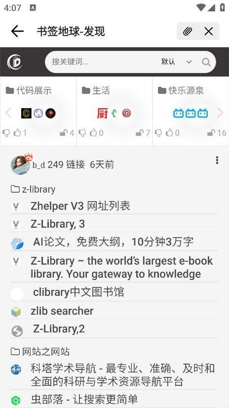 2、支持快速浏览别人分享的归类的书签和搜索书签,支持直接打开书签网站,方便我们快速发现优质书签。至于如何搜索你们要的资源,哈哈,大家都懂。