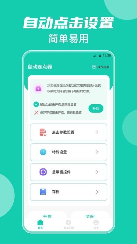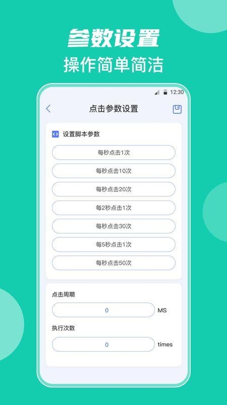 1、超简洁的界面而且功能虽然简单却很实用,对指定位置进行点击,点击速度,次数都可以设置。