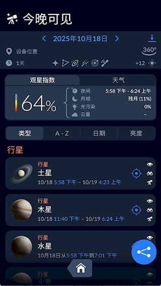 4、观星指数:结合月相、光污染、云量及天体可见时间生成评估,同步天气预报,助力规划观测时机。