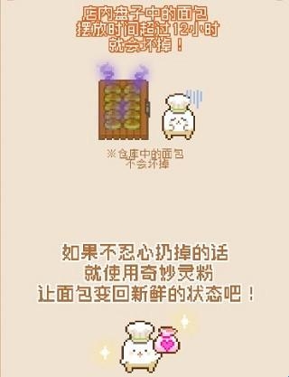 做好香喷喷的面包会存入仓库,前期仓库经常容易满,记得有金币了,要升级哦,上架的面包12小时就会过期,记得适量摆放,在仓库中储存不会过期。