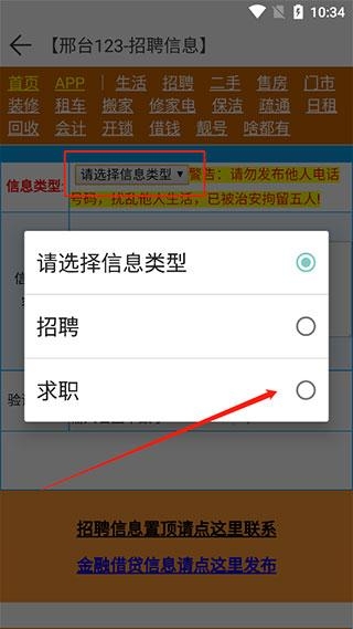 4、登录账号后,点击【请选择信息类型】,接着点击【求职】;