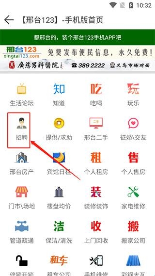1、在本站下载邢台123,打开后进入首页,点击【招聘】;